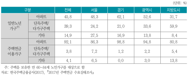 왼쪽 그래프에서 주택 유형의 대다수는 아파트인 것을 확인할 수 있습니다. 아래표(2017년 자료)에서 전체 노인가구 중에서 45.8%만 아파트를 소유하고 있는데, 주택연금 가입자는 92.1%가 아파트를 소유하고 있다는 점은 주목할만한 점이죠. 이는 아파트가 가격 산정에 용이한 점이 영향을 준 것으로 생각됩니다.