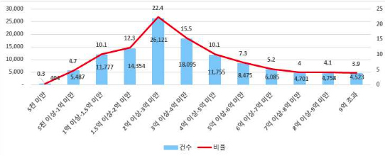 아래 그래프는 주택연금 전체 가입건의 주택가격 비율 분포를 나타낸 그래프입니다. 2억 이상 - 3억 미만이 22.4%의 비중으로 가장 많은 것으로 나타났습니다.