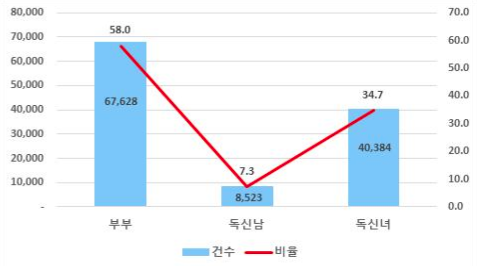 주택연금 가입한 전체 건 중 부부 58%, 독신녀 34.7%, 독신남 7.3%의 가구유형별 비중을 갖는 것으로 나타났습니다.