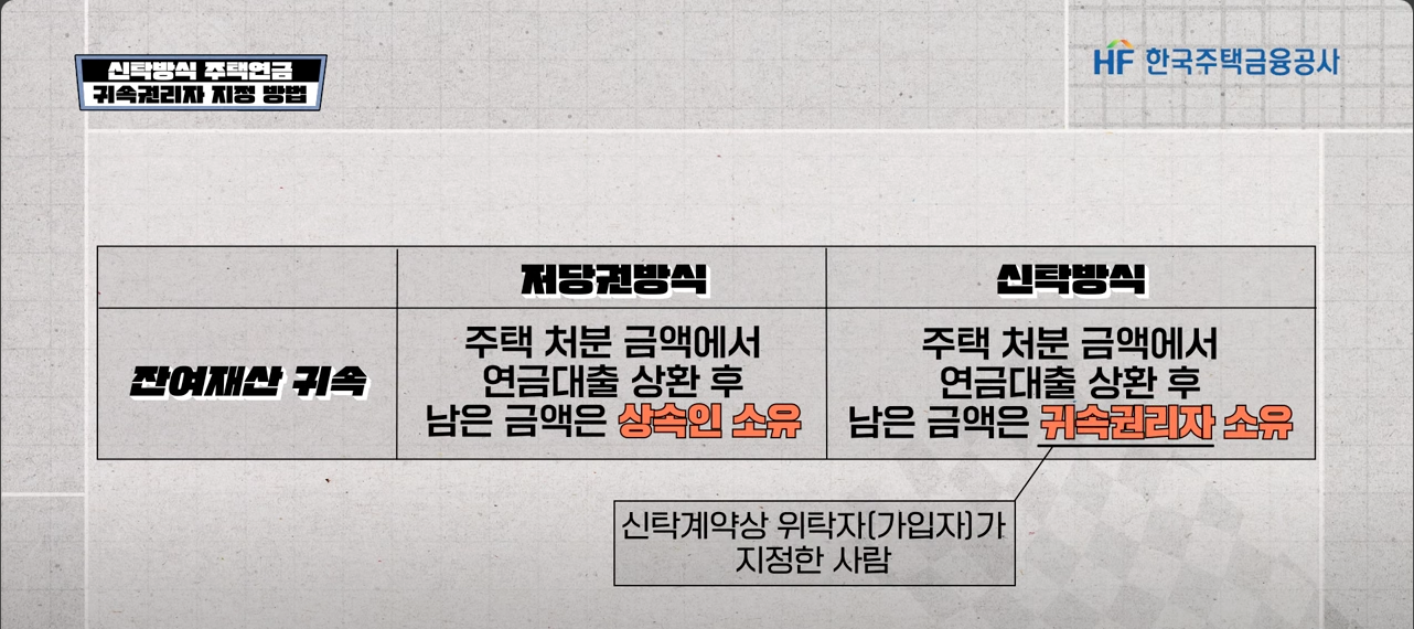 부부 모두 사망시 잔여재산을 귀속하는 사람에서도 차이가 있습니다. 주택연금 수급액수보다 주택가격이 높을 경우 남은 금액을 저당권방식의 경우 법정상속인, 신탁방식의 경우 귀속권리자에게 지급됩니다. 귀속권리자는 신탁계약 시 가입자가 지정한 사람입니다. 귀속권리자는 한 명 한 명 특정하여 지정하는 개별지정 방법과 대상자 전원(상속인, 자녀 등)을 귀속권리자로 지정하는 포괄지정 방법이 있습니다. 포괄지정 방법을 할 경우 대상자 전원 모두 귀속비율은 균등하게 됩니다.