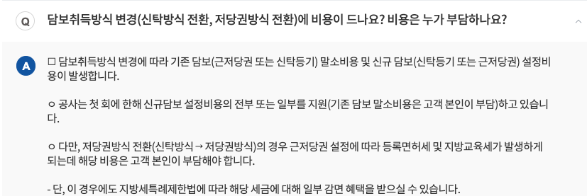 담보설정방식을 변경할 경우에 대한 주택금융공사의 답변을 스크린샷으로 가지고 왔습니다. 담보설정방식을 처음 변경할 경우 담보설정비용 전부 또는 일부를 주택금융공사에서 지원할 수 있지만, 저당권방식으로 전환할 경우 등록면허세/지방교육세 가입자 부담이라고 하네요.